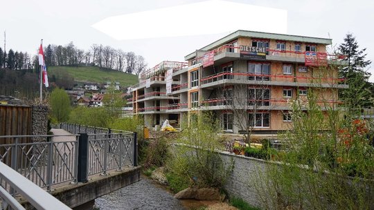 Im Zuge des Hochwasserschutzes wurde ein Aufenthaltsbereich an der Mündung von Lippisbach in die Kander geschaffen. Einblick in die Wohnanlage „Gartenstadt“, autofrei, barrierefrei, verdichtet, KFW 55 Standard, nur mit regionalen Handwerkern errichtet.