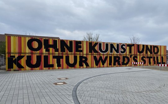 Bunte Container beim ehemaligen Güterbahnhofsareal in der Nähe des Stadtarchivs weisen auf die Misere der Kulturbranche hin.