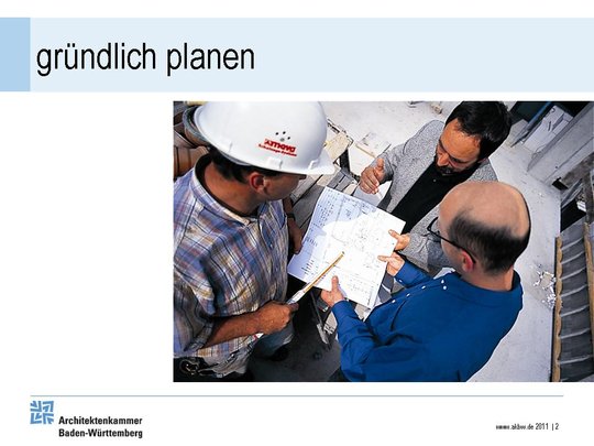 Die Unterlagen für den Vortrag "Berufsbild Architekt" erhalten Mitglieder der Architektenkammer kostenlos bei der Landesgeschäftsstelle: medien spamgeschützt @ spamgeschützt akbw.de, Telefon 0711 / 2196-151.