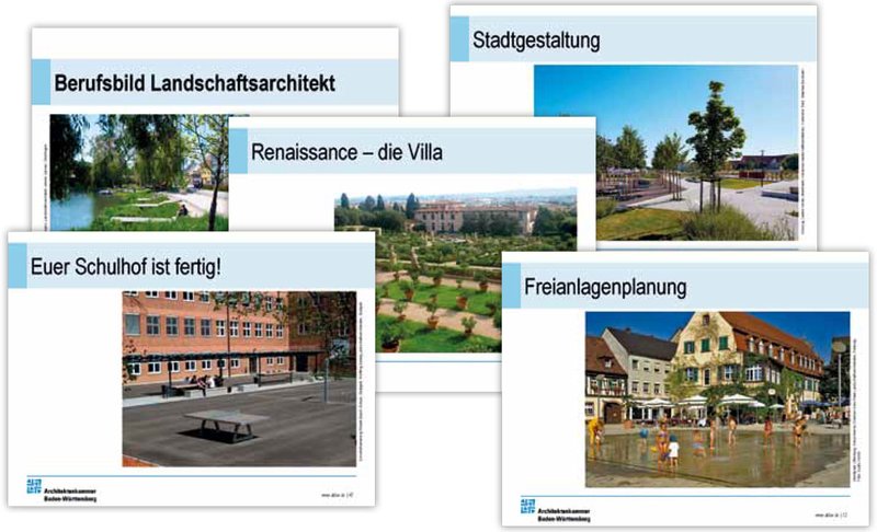 Die Berufsorientierung ist fester Bestandteil des Schulunterrichts. Häufig wenden sich deshalb Lehrer an die Eltern mit der Bitte, den Schülerinnen und Schülern aus ihrem Arbeitsalltag zu berichten und über den Ausbildungsweg zu informieren. Damit Mitglieder der Architektenkammer diesem Wunsch ohne allzu großen Aufwand nachkommen können, stellen wir fertiges Vortragsmaterial zur Verfügung - nun auch zum Berufsbild Landschaftsarchitekt/in.