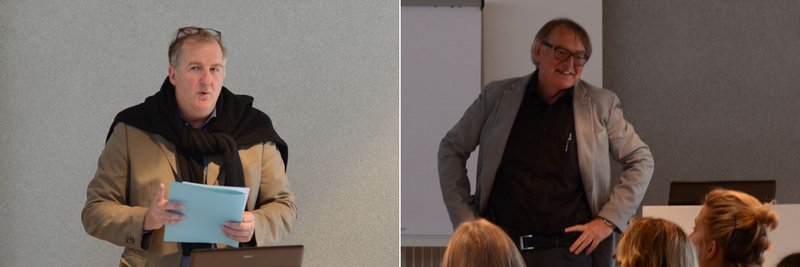 Grußwort und Fazit: Präsident Markus Müller (l.) verwies auf das Bestreben der Architektenkammer, ein kritisches Bewusstsein für baukulturelle Themen bei Jung und Alt zu schärfen. Ulrich Schwille, Mitglied des Landesvorstands der AKBW und dort für „Architektur macht Schule“ zuständig, fasste die Ergebnisse der abschließenden Diskussion zusammen.