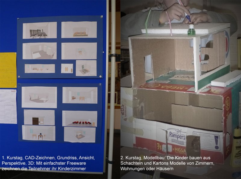 Projektbeschreibung: Wir haben 3 Nachmittage, thematisch bewegen wir uns vom Kleinen zum Großen, also Kinderzimmer – Wohnhaus – Stadt. CAD-Zeichnen mit entsprechend einfacher Freeware als Einführung zum Thema Architektur und Plan. Modellbau eines Zimmers, einer Wohnung oder eines Hauses mit Kartons, Schachteln und Abfallmaterialien (Joghurtbecher, Schraubverschlüsse etc.). Stadtmodell ebenso, wobei die Grundplatte mit Fluss und Brücke vorgefertigt ist. Ebenso Kirche und Stadtmauer als Ursprung der Stadt.