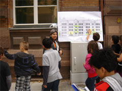 Verschiedene Elemente der Fassade wurden vorbereitend herausfotografiert in DIN AGröße und nummeriert. Diese Elemente wurden dann in der großen Fassadenansicht im Maßstab 1:50 abgedeckt und jeweils mit Buchstaben versehen. Die Schüler erhielten eine Suchkarte und mussten die Nummern mit den Buchstaben kombinieren. Unter den 14 Beispielen waren 3 Beispiele von moderneren Gebäuden aus der Umgebung, diese mussten erkannt werden, denn sie gehörten nicht zum Lösungswort, das sich aus der richtigen Kombination ergeben sollte.