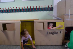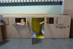 Material und Werkzeug: Riesige Kartons, Wandfarbe, Klebeband, Schnüre. Bleistift, Lineal, Geodreieck, Schablonen, Skizzenpapier, Dreikant-Maßstab, CAD-Programm („Planner“-Programm als Freeware im Internet).