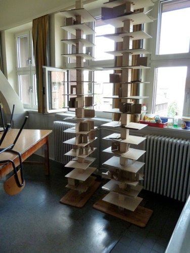 Über Hochhäuser hatten die Klassen eine kleine Unterrichtseinheit gehört, einige Schüler(innen) hatten selbst im Internet und Architekturbildbänden Recherchen angestellt. Die Grundrissgestaltung, die Wahl der Raumfolge, ihre Ausrichtung, ihre Farbgestaltung in exemplarischen Beispielen, all das fand nun zumeist in regem Austausch untereinander statt. Noch immer aber wurden auch die Meterstäbe, die Maßstabslineale gebraucht, um Maße am lebenden Modell zu klären, Tischhöhen zu ermitteln. Materialien wurden getauscht, Ideen stibitzt oder großzügig weitergegeben. Fairness unter den "Häusle-Bauern" war ab und zu auch ein Thema. Die Fassaden, seit der Moderne von der Aufgabe für Stabilität zu sorgen befreit, konnten am Ende mit dünnem Nylonfaden vorgespannt werden, um den Anschein einer durchgehenden Glasfassade zu bieten. Am Ende stellten die Wohntürme für die Sechstklässler ein sichtbares Zeichen ihrer Erfahrung mit dem Thema Architektur dar. Einige Schülerinnen und Schüler waren sogar bereit, den aufwendigen Auf- und Abbau der Türme beim Umzug aus dem Zeichensaal mitzutragen, z.B. um sie für Veranstaltungen neu zu installieren.