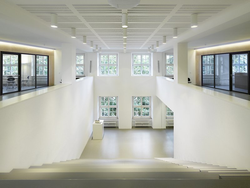 Eine großzügige Tribünen- und Treppenlandschaft im Kopfteil des Gebäudes verbindet beide Ebenen und dient der Agentur als zentrales Forum, in dem Veranstaltungen, Präsentationen, Pausen, Besprechungen sowie die wöchentliche Montagsrunde für alle 150 Mitarbeiter mit den News der Agentur stattfinden können. Der durchgängig homogene Bodenbelag der Agentur aus einem warmgrauen Kautschuk zieht sich gleichfalls über die Tribüne und Treppe und stärkt die räumliche Zusammengehörigkeit der beiden Etagen. Umrahmt wird das Forum von hölzernen Wänden aus Birken-Multiplexplatten, die auch das Firmenlogo, ein stilisiertes trojanisches Pferd, eingebrannt haben. Dahinter befinden sich die Büros der Geschäftsführer sowie der Assistenz und der große Konferenzraum. Angegliedert an das Forum unterstützt eine offene Bibliothek die Interaktion auf der Tribünenlandschaft.