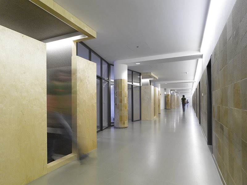Für die neuen Büroräume der Werbeagentur Jung von Matt am Neckar wurden im ehemaligen Arbeitsamt in Stuttgart zwei Etagen auf einer Gesamtfläche von 2000 m² umgebaut. Unter Wahrung der bestehenden Grundstruktur des Gebäudes wurden die alten Bürozellen modernisiert, sowie etliche neue Büroflächen mit gläsernen Raumtrennungen geschaffen. Erhalten werden konnte die charakteristische, mit Solnhofer Steinplatten verkleidete Flurwand sowie die alten Holztüren in ihren Stahlzargen, welche mit neuen Glasfüllungen versehen wurden und damit den innenliegenden Flur stärker belichten. Diese Bestandselemente tragen wesentlich zur Wahrung der ursprünglichen Identität des Gebäudes bei und finden in den neuen Einbauten ihre Entsprechung in Proportion, Material- und Farbgebung.