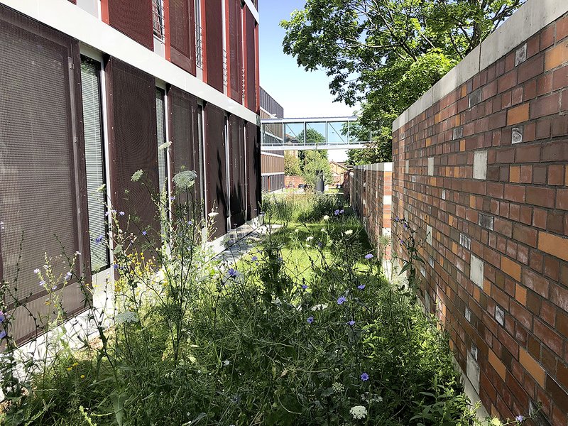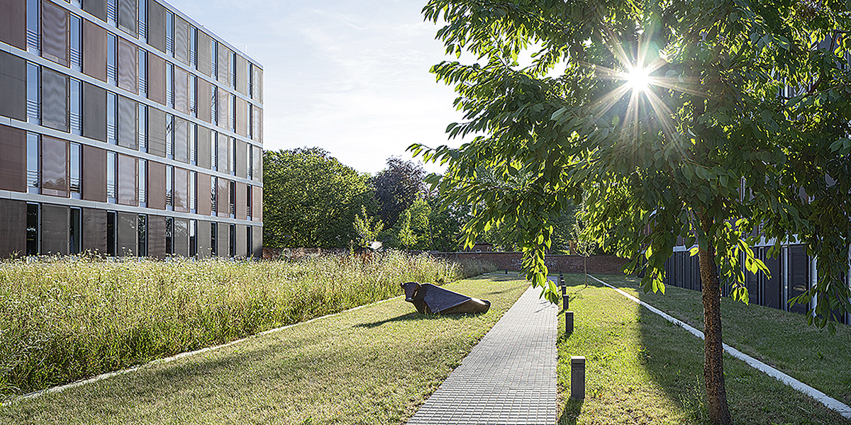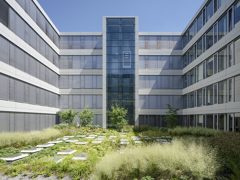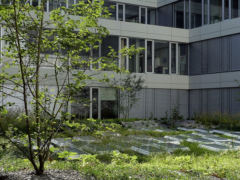 Eine strukturell und farblich abwechslungsreiche, aber dennoch pflegeleichte Bepflanzung des Innenhofs bildet den Blickfang im Lichthof und bringt einen erholsamen grünen Aspekt mitten ins Gebäude. Schirmförmige, lichte Felsenbirnen als Hauptelement schweben über einer flächigen Unterpflanzung aus Stauden, immergrünen Bodendeckern, Farnen und Gräsern.