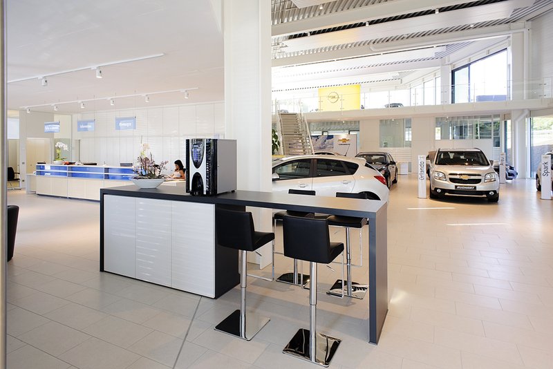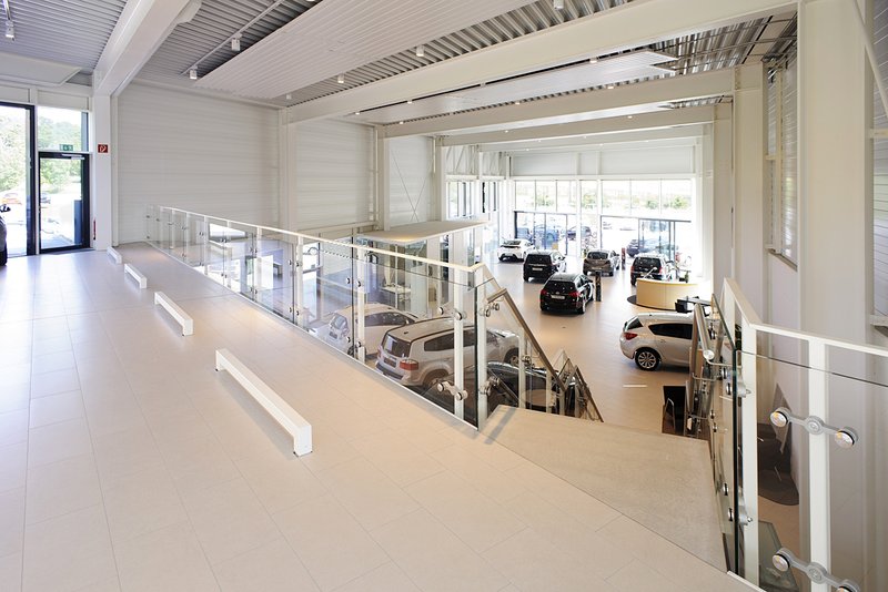 Der gläserne Hauptzugang zum Autohaus wird durch ein mächtiges freistehendes Vordach betont. Nach dem Passieren der dunklen Außenhaut betritt der Kunde das strahlend weiße Interieur der Kundenannahme, von der sich die beeindruckende zweigeschossige Außenausstellungshalle erahnen lässt, aber auch Aktivitäten in der Direktannahme beobachten lassen.