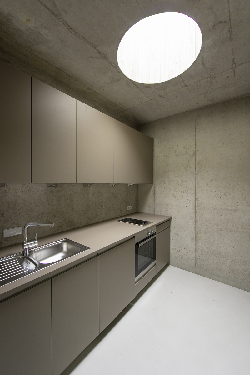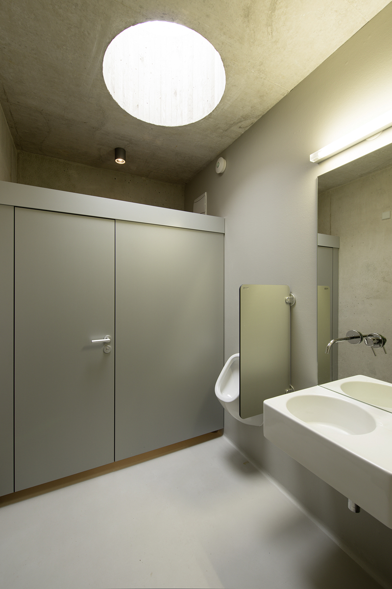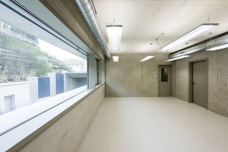 Auf die klare und reduzierte Fassadengestaltung wurde im Inneren des Baus mit einem spartanischen Innenausbau reagiert. So wurden die Innenräume nach dem Prinzip Rohbau = Ausbau konzipiert. Der Baustoff Beton ist in Wand und Decke das vorherrschende Material, und alle zusätzlichen Bauteile wurden mit ähnlicher Farbigkeit dem Grau des Betons hinzuaddiert. So entsteht eine Einheitlichkeit, die dem monolithischen Entwurfsansatz und der nüchternen Nutzung entsprechend ist.