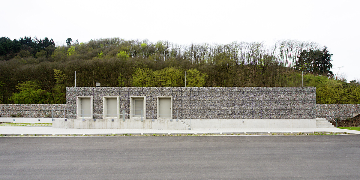 Der eingeschossige mit einem Löschwasserbecken teilunterkellerte Baukörper ist mit einer Fassade aus Gabionensteinkörben verkleidet, die mit Schwarzwaldgranit gefüllt sind. Der Baukörper wird gegliedert durch sorgfältig detaillierte Fenster- und Türöffnungen mit markanten Leibungen aus Sichtbetonfertigteilen. Das Fassadenmaterial wurde bewusst für das Betriebsgebäude und die begleitenden Lärmschutzwände gewählt, ebenso wurde das Dach mit demselben Schwarzwaldgranit bedeckt. Zusammen ergibt sich ein in die Lärmschutzwände eingefügter, monolithischer, steinerner Baukörper, der sich in Materialität und Kubatur in die umgebende Landschaft und bauliche Umgebung einfügt. Auf umgrenzende Maßnahmen wie Zäune und Tore konnte verzichtet werden, so dass sich das Gebäude nicht von der angrenzenden zweigeschossigen Wohnbebauung abgrenzt. Eine zurückhaltende Zonierung zwischen öffentlichem und privatem Raum wird über Pflanzungen und unterschiedliche Bodenbelagsmaterialien gewährleistet.