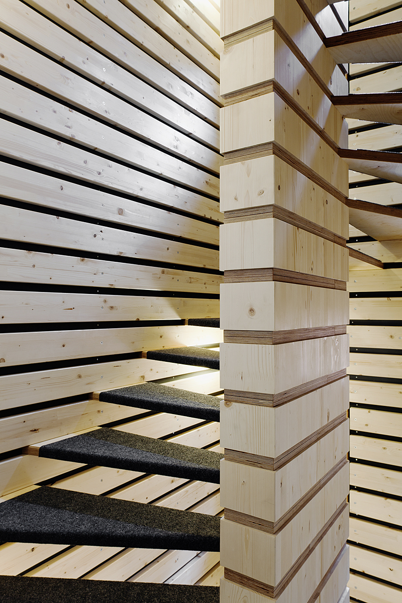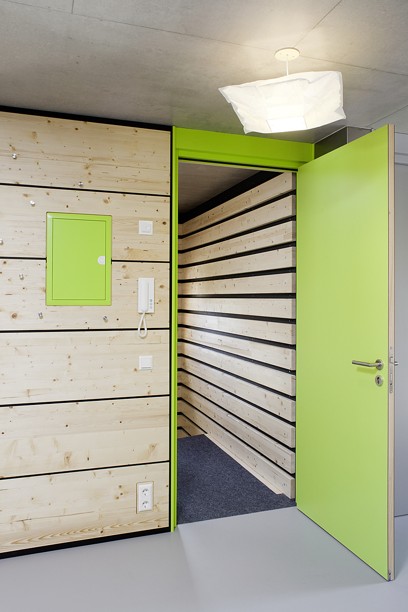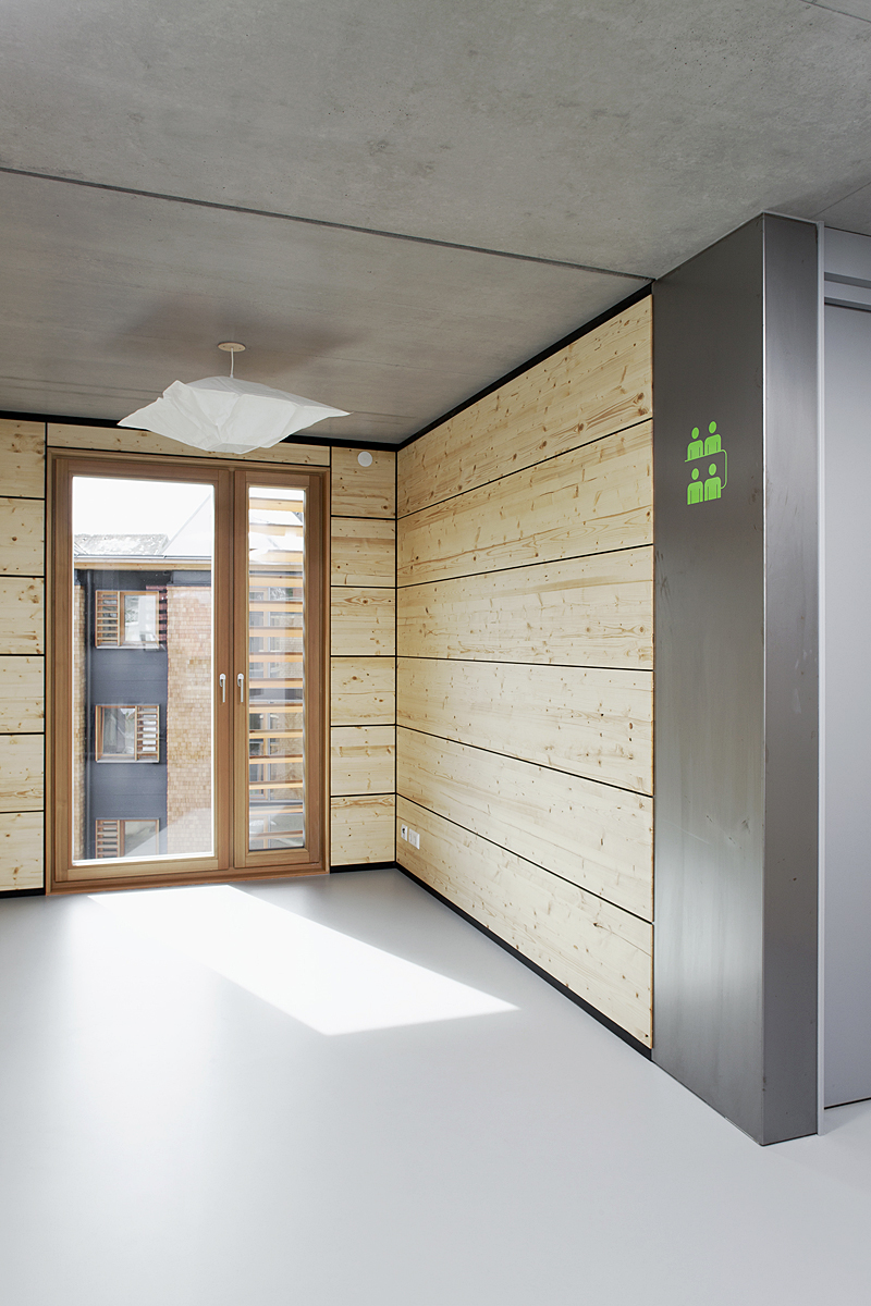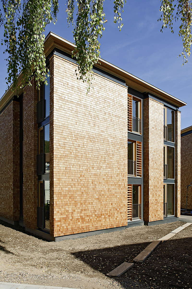 Dem architektonischen Grundsatz folgend, dass neben der Form die Materialität die Qualität eines Gebäudes bestimmt, wurde der regionale Baustoff Holz als dominierendes Material gewählt. Alle drei Gebäude sind in gleicher Bauweise, mit gleichen Abmessungen und Standards erstellt. Als Orientierungshilfe sind die gemeinschaftlich genutzten Räume der einzelnen Häuser farblich unterschiedlich gestaltet. Die Fassadenbeplankung wurde mit unbehandelten heimischen Lärchenholzschindeln ausgeführt. Im Interesse einer gehobenen Nachhaltigkeit verfügen die Gebäude über eine einheitliche, klare Struktur auf der Basis sich wiederholender, vorgefertigter Raummodule. Insgesamt wurden 36 Raumzellen in der Werkhalle des Zimmereibetriebs vorgefertigt und vor Ort auf der Baustelle zusammengesetzt. Die Montagezeit für den Rohbau konnte so auf lediglich einen Tag reduziert werden. Aktuelle, computergestützte Fertigungstechniken sowie hochwertige Materialien sorgen, im Verbund mit einem hohen Grad an Vorfertigung, für einen niedrigen Energiebedarf und einen langfristig kostengünstigen Betrieb.