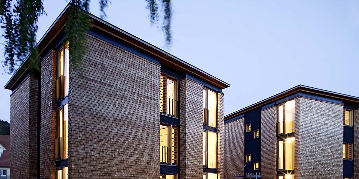 Miteinander statt nebeneinander: Die 2011 fertiggestellten Studentenwohnheime nahe der Hochschule Furtwangen bieten ihren Bewohnern nicht nur viel Platz im eigenen Zimmer. Das Konzept sieht vor allem großzügige Gemeinschaftsräume und Außenanlagen vor, um der Anonymität studentischer Wohnanlagen entgegenzuwirken.