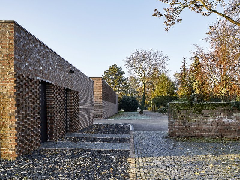 Die Erschließung erfolgt weitgehend über zwei Zufahrten und den innenliegenden Hof. Der Betriebshof mit dem Krematorium ist ein reines Betriebsgelände ohne Besucherverkehr. Der Übergang von der Öffentlichkeit des Friedhofs zur Betriebsamkeit des Werkhofs wird durch einen Wechsel von einer Backstein- zu einer hinterlüfteten Aluminiumfassade aus perforierten Trapezblechen verdeutlicht. Die einfache und klare Atriumtypologie mit ihrer ruhigen Außenwirkung und den optimierten Betriebsabläufen im Inneren bildet sich im Kontrast der gewählten Fassadematerialien ab.