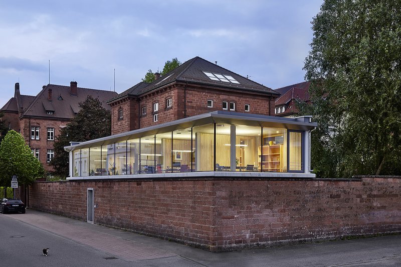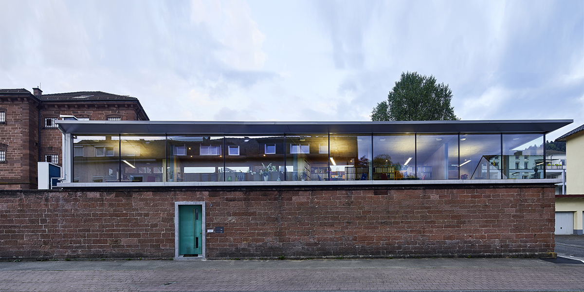 Das Ergebnis einer notwendigen Büroraum-Erweiterung auf dem Grundstück eines ehemaligen badischen Gefängnisses fügt sich als Solitär konkurrenzlos in die vorhandene dominante Gebäudestruktur ein. Ohne die durchgehend strenge Begrenzung durch die Außenmauer zu öffnen, wird ein liegender Glasgebäude-Riegel an der Maueroberkante sichtbar. Lediglich ein unauffälliger Türdurchgang auf der Straßenseite der Mauer gewährt Zutritt zum von außen unsichtbaren Erdgeschoss. Das sichtbare, lichtdurchflutete Obergeschoss erfreut mit seinem Ausblick über die Mauer. Auch die sorgfältigen Sichtbetonflächen kombiniert mit Weißtanne der Einbauten beeinflussen die Raumatmosphäre positiv.