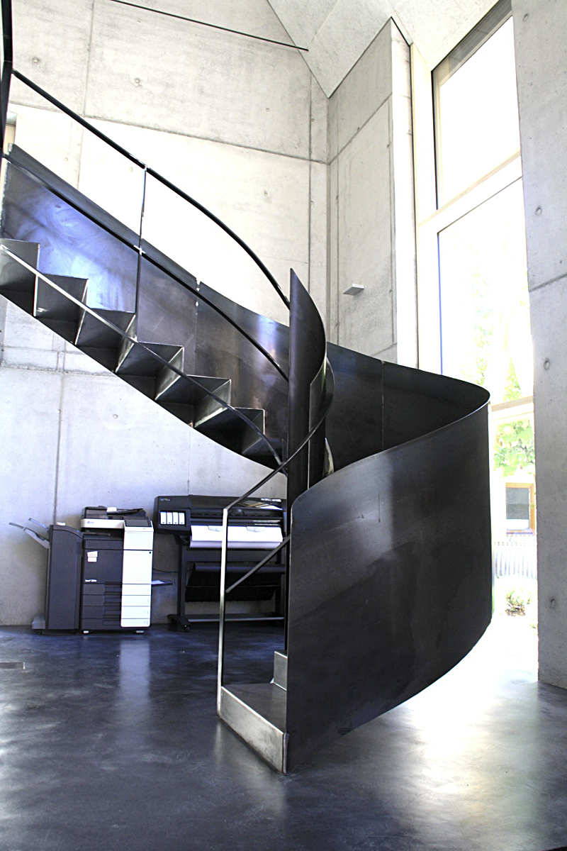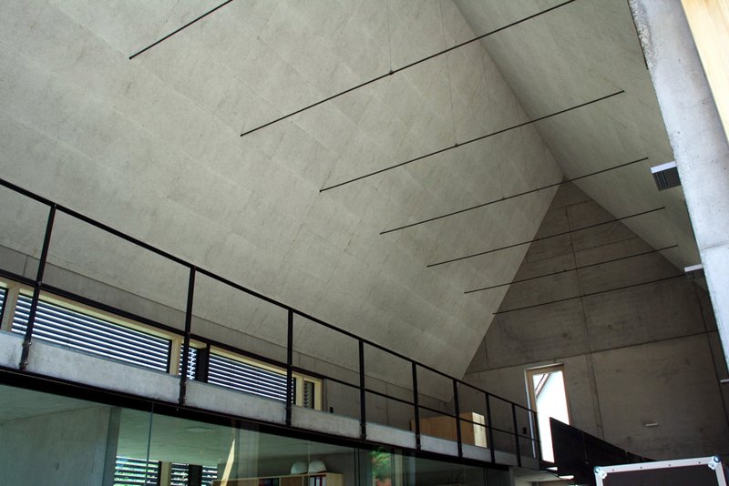 Das Innere des Gebäudes besteht komplett aus Rohmaterialien, so wurde der "Werkbeton" sichtbar gelassen, die Treppe in blankem Stahl, die Decke aus Heraklit-Platten und der Fußboden als Industrieboden erstellt. Alle Oberflächen zeigen deutliche Handwerksspuren – Material und Verarbeitung in seiner reinen Form. Lediglich die Möbel wurden fein herausgearbeitet und aus massiver Weißtanne gefertigt.