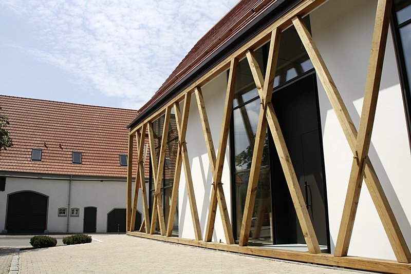 Das äußere des Gebäudes wurde an ein traditionelles Bauernhaus angelehnt. Bei der Konstruktion des Fachwerks wurde viel Wert auf traditionelle zimmermannsmäßige Handwerkskunst gelegt. Sichtbares Eichenfachwerk mit Verbindungen aus Holznägeln mit Holzverkleidung, schräge Hakenblätter ebenfalls durch Holznägel gesichert und Fersenversatz am Ortgangsparren. Die zurückgesetzte weiße Putzfassade, Zierbretter an der Traufe, Holzschneefang, Sandsteinabdeckungen und Zierelemente zitieren Element eines klassischen Bauernhauses.