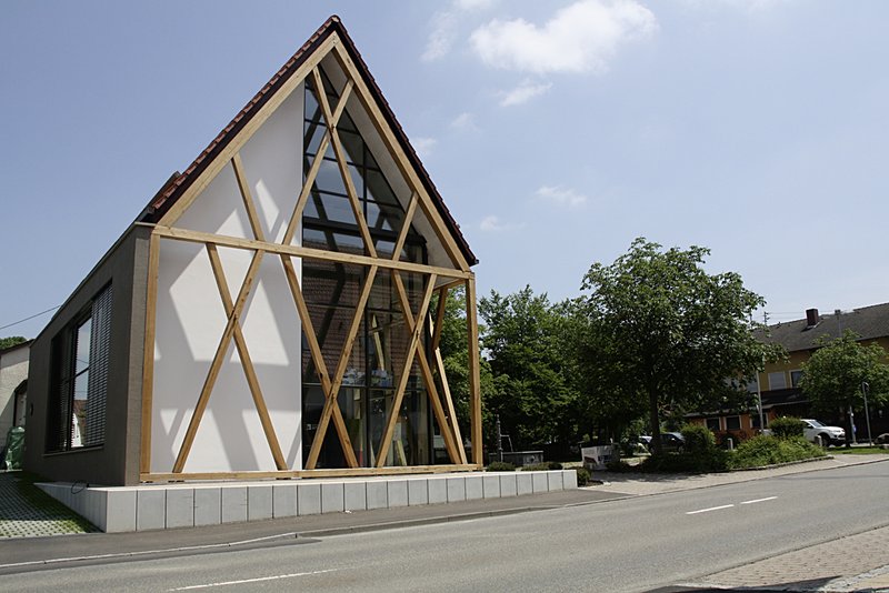 Um den Dorfplatz ist ein älterer Baubestand von teils verputzten, teils unverputzten Fachwerkhäusern versammelt. An der Stelle eines abgerissenen bäuerlichen Anwesens entstand ein Bürohaus, das mit dem Satteldach die Bauform der Umgebung aufgreift, jedoch mit den Materialien des eigentlichen Baukörpers und im Innenraum eine klare, moderne Materialsprache hat. Zur Straße und zum Dorfplatz hin ist eine nichttragende Fachwerkkonstruktion vorgeblendet, die das traditionelle Fachwerk der Umgebung zitiert und sich in seiner Dimensionierung und konstruktiven Funktionslosigkeit zugleich augenzwinkernd distanziert. Das Gebäude formuliert den modernen Charakter seiner Nutzung und seines konzeptionellen architektonischen Grundgedankens.