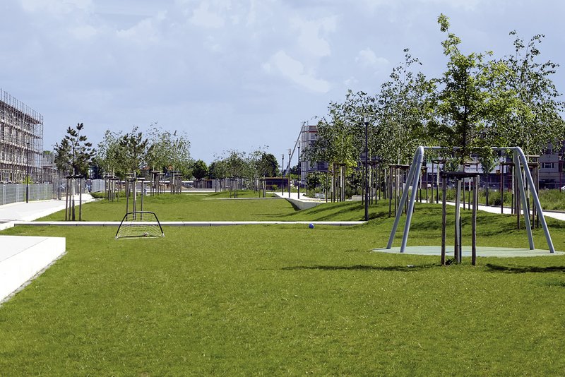 Das zentrale Wiesenband liegt in einem Rahmen aus Wege- und Aufenthaltsbereichen. Es wird durch Stufen aus Weißbeton gefasst, welche zusammen mit den Flächen aus weiß abgestreutem Asphalt zum hellen Passepartout der offenen Mitte werden. Endpunkte des Parks im Osten und Westen sind zwei Baumdächer, die einen Spielbereich und eine erhöhte Plattform mit Sitzbank überschatten.