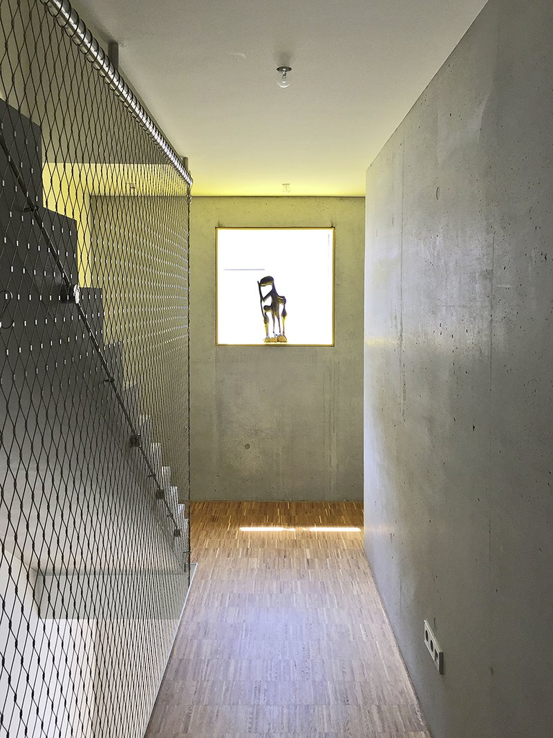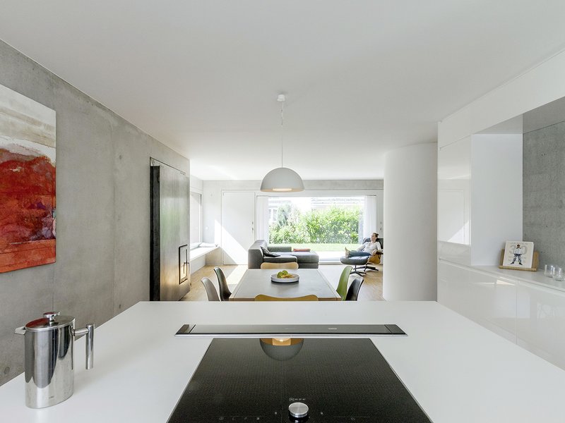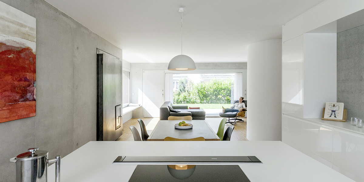 Die Konstruktion aus Stahlbeton, wird im Innern als Sichtbeton erlebbar. Massives Eiche-Parkett, weiße Wände und lichtgraue Holzfenster bestimmen die Innenräume. Rohes Stahlblech beim Kamin, Edelstahlgewebe im Treppenraum und gezielt gesetzte Farbakzente erzeugen atmosphärische Stimmungen …