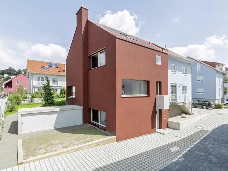 Die Stadt verlangte als gestalterische Vorgabe in diesem Gebiet ein rotes Ziegeldach. Um dem Gebäude eine plastische Präsenz und eine poetische Form zu verleihen, entschieden wir uns für eine monochrome Farbgebung von Dach, Wand und Details in Ochsenblutrot – eine Farbe, welche sich von den gezielt ausgesuchten Dachziegeln ableitet. Die scheinbar kräftige Farbe strahlt in ihrem bunten und heterogenen Umfeld eine erstaunliche Ruhe und Gelassenheit aus und stärkt die Identität des Hauses.
