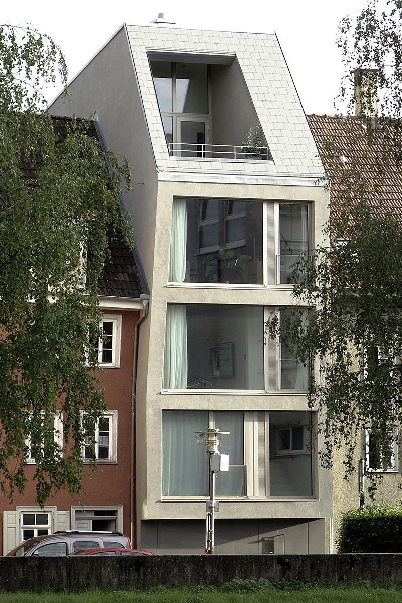Nach intensiver Voruntersuchung und Planung entschloss sich der Bauherr, ein eigenständiges und nicht historisierendes Gebäude mit zeitgerechtem Erscheinungsbild und großem Wiedererkennungswert zu realisieren. Nach Auswertung der städtebaulichen Situation entstand eine fünfgeschossige Gebäudeskulptur, die die Firsthöhe der höchsten Bestandsgebäude aufnimmt. Das Stadthaus „Die Spalte" öffnet sich mit seinen großen, verglasten Fassaden zur Stadt und zur Donau hin und lässt viel Licht in den Innenraum. Das Gebäude ist von zwei Seiten erschlossen. Im Erdgschoss befinden sich Nebenräume, Garage und Haustechnik. Die restlichen Geschosse sind zum Wohnen vorgesehen. Eine innenliegende Loggia gibt den Blick auf die Donau frei. Ein kleines Atrium im Erdgeschoss lädt zum Verweilen im Garten ein.