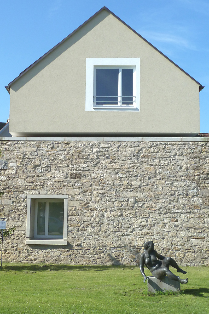 Als nördlicher Abschluss der Altstadt durchzieht die historische Stadtmauer den mittlerweile überbauten Teil der Weikersheimer Innenstadt. Angrenzend an das vormals durch eine Schlosserei überbaute Grundstück, wurde im Zuge der Altstadtsanierung das Areal durch die Anlage eines Parks aufgewertet. Die durch den Bau der Schlosserei entstandene Lücke in der Stadtmauer wurde im Zuge der Baumaßnahme geschlossen und zu einem Entwurfsbestimmenden Faktor der Arbeit. Dieses „Wohnen an der Stadtmauer“ mit seiner Nähe zum historischen Kern von Weikersheim zeigt wie neues Wohnen in der alten Stadt aussehen kann.
