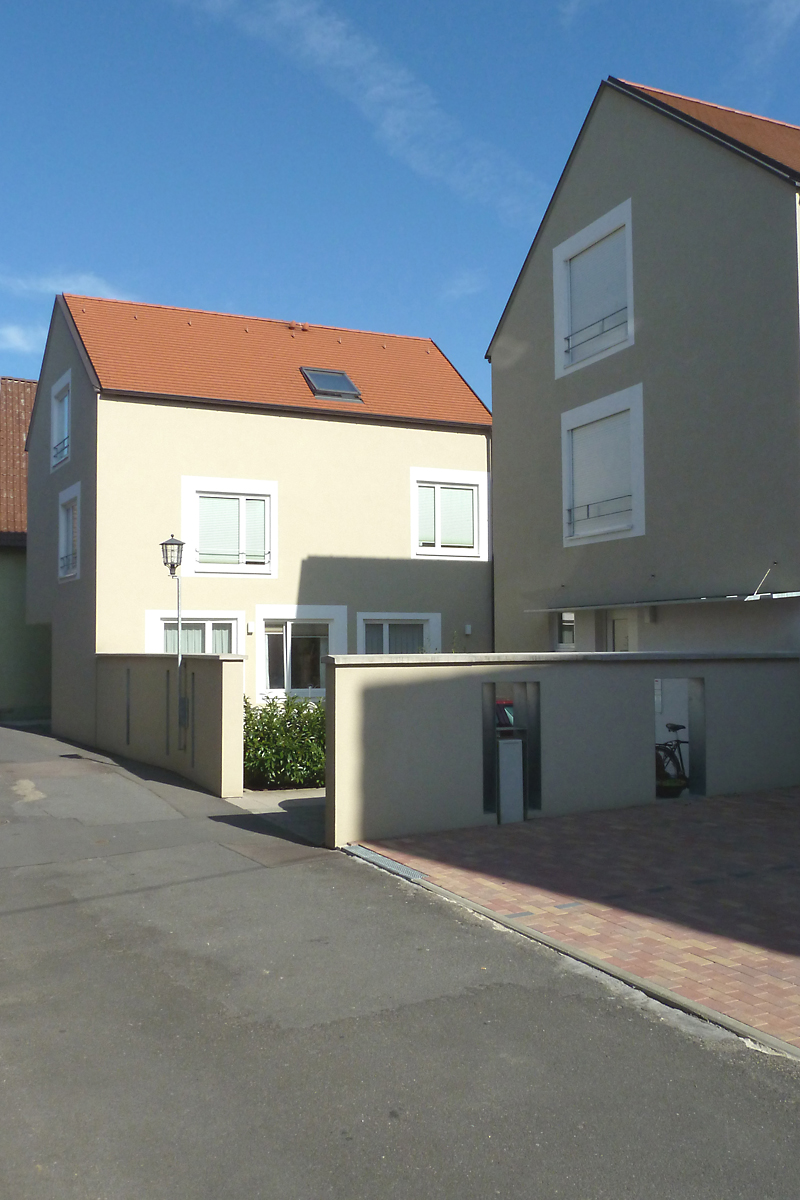 Aufgrund der sehr beengten Situation, die beiden Grundstücke haben zusammen nur 330 qm, entschied man sich, zwei Einzelhäuser versetzt und als Grenzbebauung auf dem Grundstück zu platzieren. Dadurch wurde es möglich, jedem der beiden Häuser einen kleinen, aber ebenerdigen Außenbereich zu zuordnen und die Belichtungssituation zu optimieren. Zwischen Haus 11 und dem angrenzenden Bestand entstand zusätzlich eine neue Gasse, die die historische Altstadt mit den Versorgungseinrichtungen fußläufig verbindet. Das Haus 13 ragt über die Stadtmauer und bezieht sich somit auf seine baulich historische Nachbarschaft, bei der ebenfalls Mauer und Haus eine räumliche Einheit bilden. Aufgrund der schwierigen Gründungssituation wird auf eine Unterkellerung der Gebäude verzichtet. Ein „Kellerersatzraum“ an der Gasse schafft die gewünschte Intimität der privaten Außenbereiche und wird gleichzeitig als große Stadtterrasse benützt.