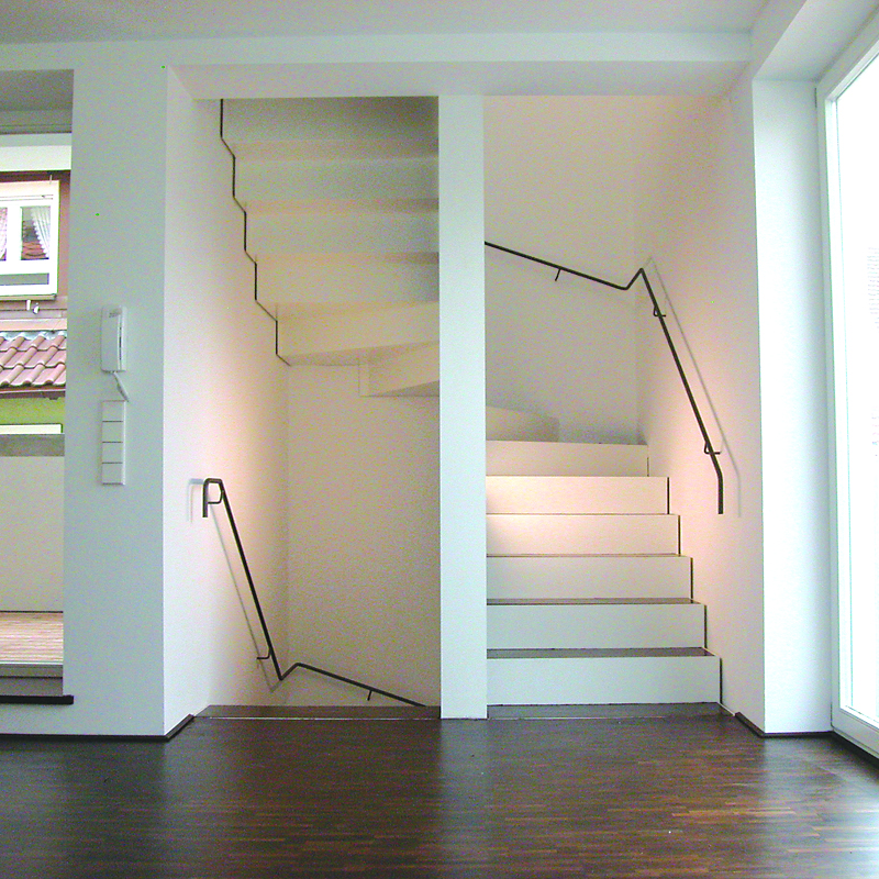 Durch viele innere und äußere Bezüge der beiden Häuser handelt es sich bei der entwickelten Haustypologie im Grunde um ein Doppelhaus, bei dem jedoch beide Parteien als Einzelbauten realisiert wurden.