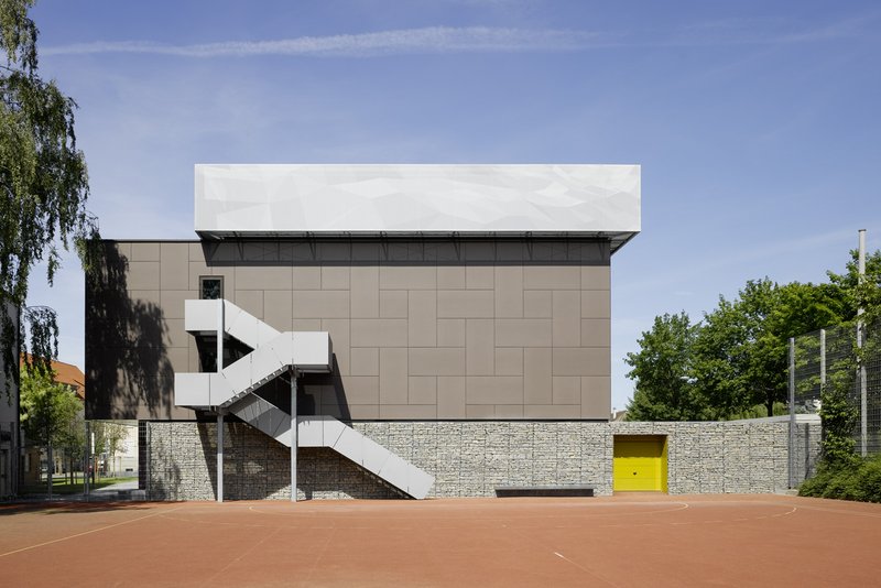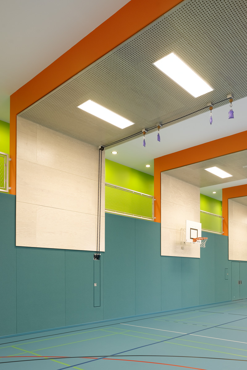 Die bestehende Turnhalle der Grund- und Hauptschule befand sich in einem maroden Zustand. Aufgrund der geringen zur Verfügung stehenden Grundstücksflächen und dem Wunsch nach Erhalt des vorhandenen Allwetterplatzes, wurde eine Stapelung der nun erforderlichen zwei Übungseinheiten konzipiert. In der von zwei- bis dreigeschossigen Gebäuden geprägten Umgebung, stellt die Integration dieser Doppelturnhalle jedoch ein Problem hinsichtlich der Höhenentwicklung dar. Besonders dann, wenn der vier Normalgeschossen entsprechende Baukörper als ein strenger Kubus behandelt würde.