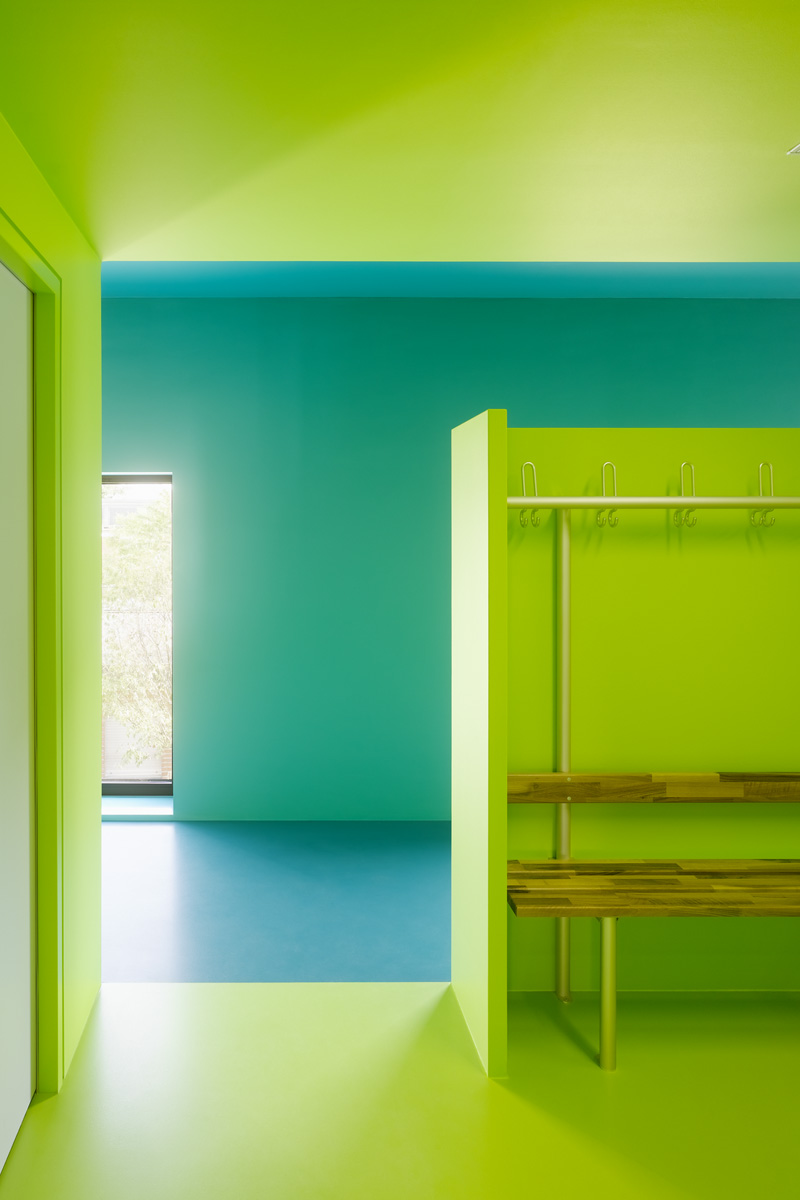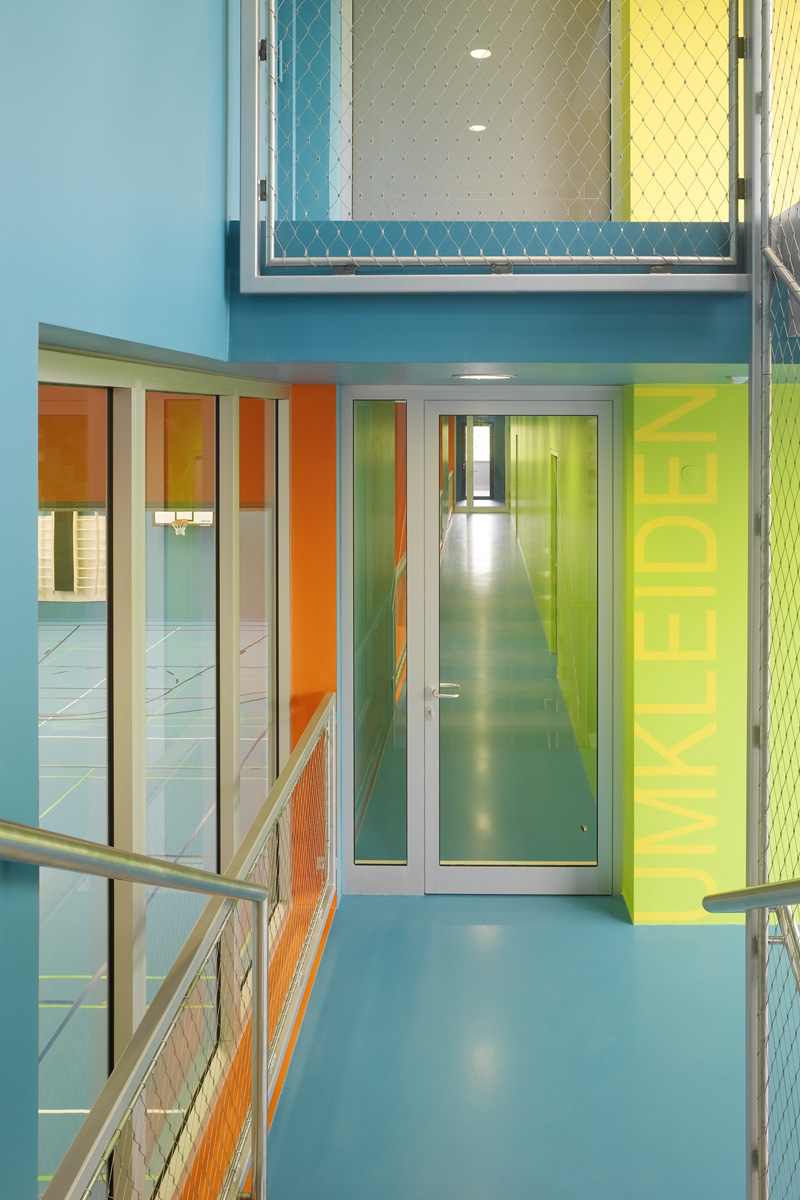 Im Kontrast zum äußeren materialbetonten Fassadenkonzept, stehen die Farbräume im Inneren. Boden, Wände und Decken bilden eine Einheit. Als Grundfarbe zieht sich ein Türkiston durch alle Bereiche. Die eingestellten Umkleide- und Nebenräume werden differenziert dazu behandelt. So stapeln sich drei Boxen von Magenta über Grün zu Gelb übereinander. Über den Eingangsbereich und die Fensterleibungsflächen der Obergeschosse tritt das Farbspektrum nach Außen.