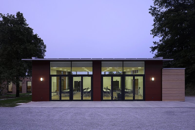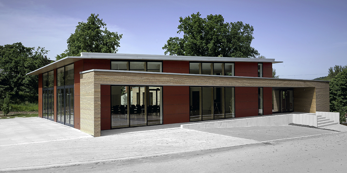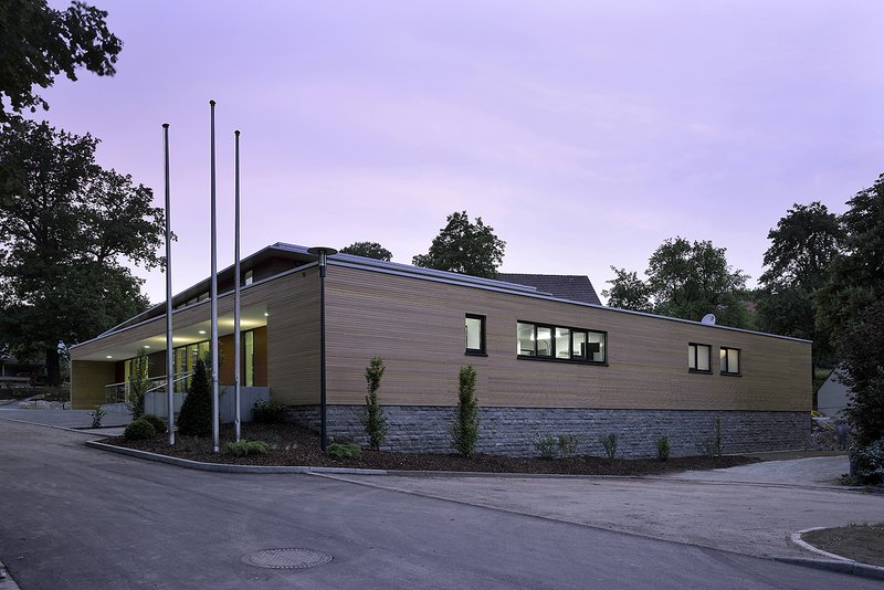 Ein rechteckiger Saalbau (16,75 m x 12,50 m; Nutzfläche ca. 201,31 m²) mit Pultdach dient als Mehrzweckraum. Eine großflächig öffenbare Fassade erlaubt den räumlichen Bezug zum angrenzenden Fest- und Zeltplatz des Dorfes. Östlich des Saalbaus dockt der langgestreckte Körper des Nebenbaus (7,26 m x 28,385 m) an, der das Grundstück talseits städtebaulich abschließt. Durch ein Flachdach mit extensiver Begrünung setzt sich der Nebenbau mit einer weit geringeren Gebäudehöhe als untergeordnetes Bauvolumen ab. So vollzieht der Entwurf die Staffelung des Hanggeländes nach.