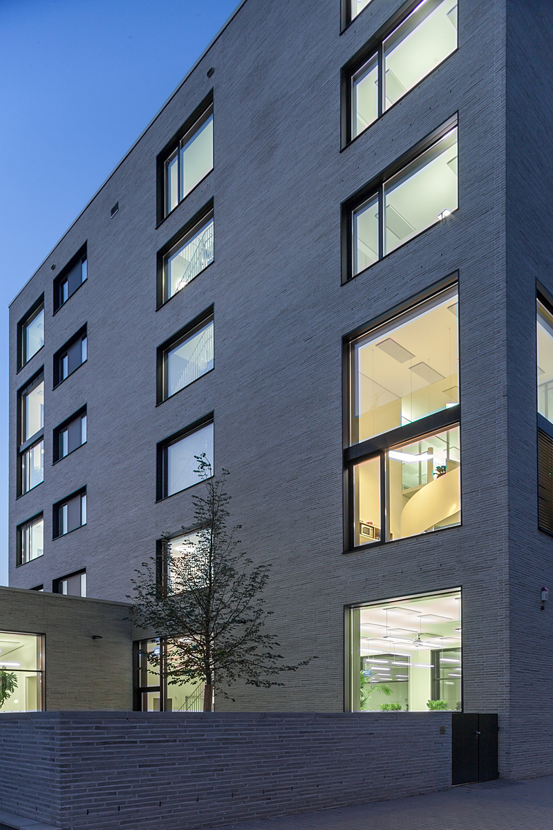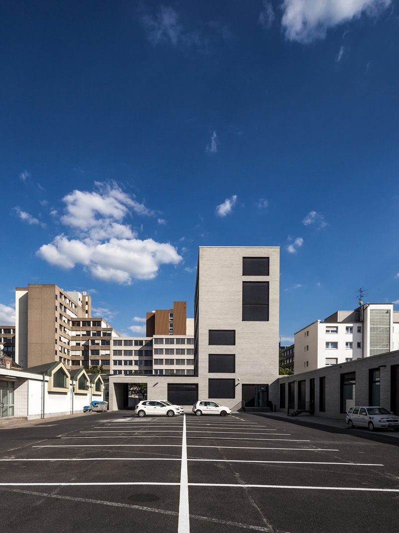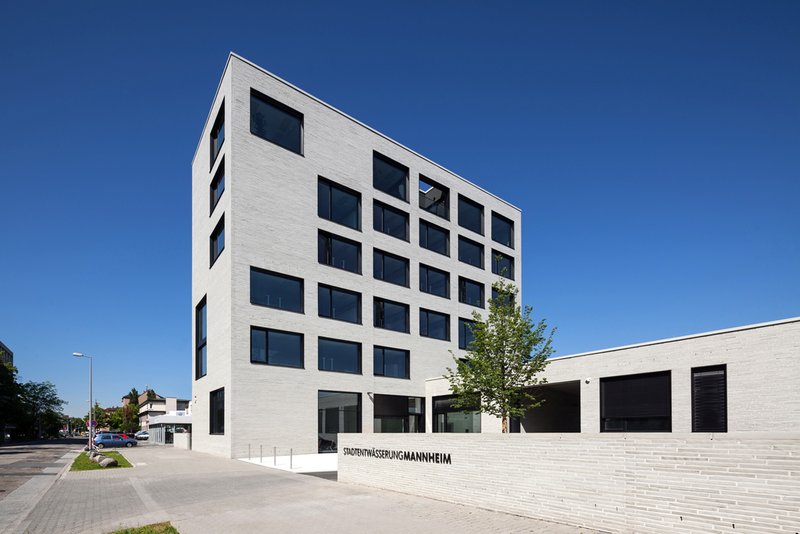 Der vorhandene Maßstab und das Material wurden aufgenommen, die straßenseitige Abfolge der Portalhäuser typologisch fortgesetzt, aber über die signifikante Höhe neu interpretiert. Der sechsgeschossige Verwaltungsbau in seiner schlanken und spannenden Stellung zur Käfertaler Straße bildet nun die neue Adresse der Stadtentwässerung im Straßenraum.