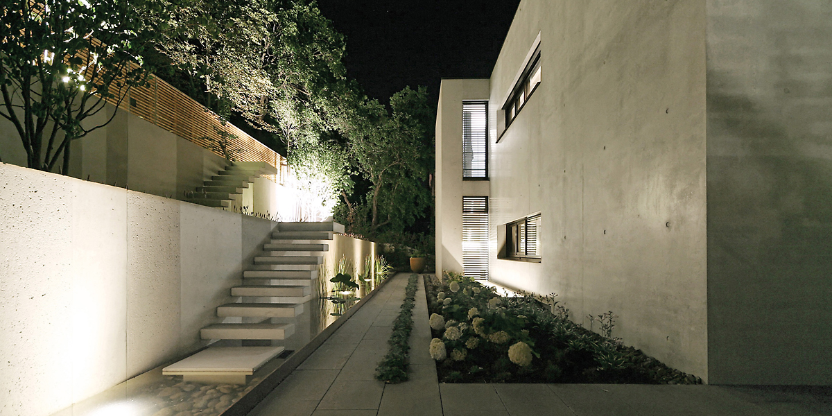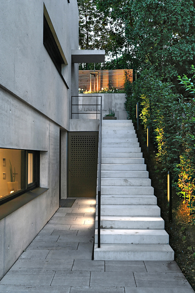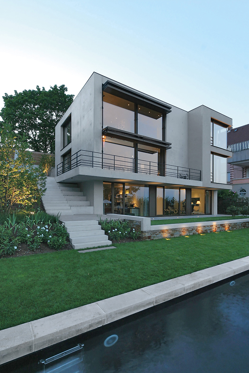 Fast scheint der Kubus über Stuttgarts Talkessel zu schweben: Hoch über der Straße trägt ein zurückgesetztes Gartengeschoss die zwei oberen, überkragenden Ebenen. Die Fassade des Baukörpers wird durch große Verglasungen nach Süden und Westen geöffnet – die anderen Seiten sind geschlossener, nur schmale Fensterbänder bieten gezielte Ausblicke, aber kaum Einblick. Wärme – ein Wort, das man nicht zwingend mit Beton in Verbindung bringt. Aber das Sichtbetonhaus in begehrter Halbhöhenlage strahlt Wärme aus. Der Ton von eloxiertem bronzefarbenem Alu, aus dem die Fensterprofile, der Sonnenschutz und das Garagentor mit Lochblech-Optik sowie die Außentüren hergestellt sind, reflektiert auf den hellen, teilweise sandgestrahlten Sichtbeton und setzt warme Akzente.