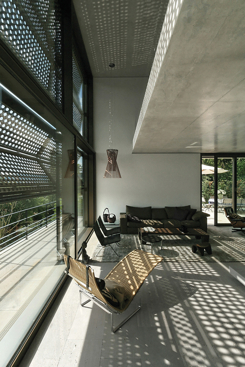 Auf der östlichen Seite liegen die Küche und der Essbereich mit großem Esstisch, das Wohnen orientiert sich nach Westen. Von dort gelangt man ebenerdig auf die direkt anschließende Terrassenfläche. Im Geschoss darüber befinden sich Schlafzimmer, Ankleiden, Bad und der offene Arbeitsraum. In diesem Bereich verbinden ein Luftraum und die zweigeschossige Verglasung die beiden Ebenen. Der außen liegende Sonnenschutz, der oft nur eine kleine Nebenrolle spielt, ist hier prägendes gestalterisches Element: Nach oben geklappt, funktionieren die gefalteten Metallsegmente, die die stringente Ordnung der Fassade kontrastieren, wie ein konstruktiver Sonnenschutz. Geschlossen schafft das Lochblechmuster bei starker Sonneneinstrahlung wunderbare Lichtstimmungen in den Räumen. Der Sohn bewohnt eine eigene Etage - das in den Steilhang geschobene Gartengeschoss. Daneben finden ein Fitnessraum und das Gästezimmer Platz, alle mit direktem Zugang zur Gartenebene und zum etwas tiefer liegenden Pool.