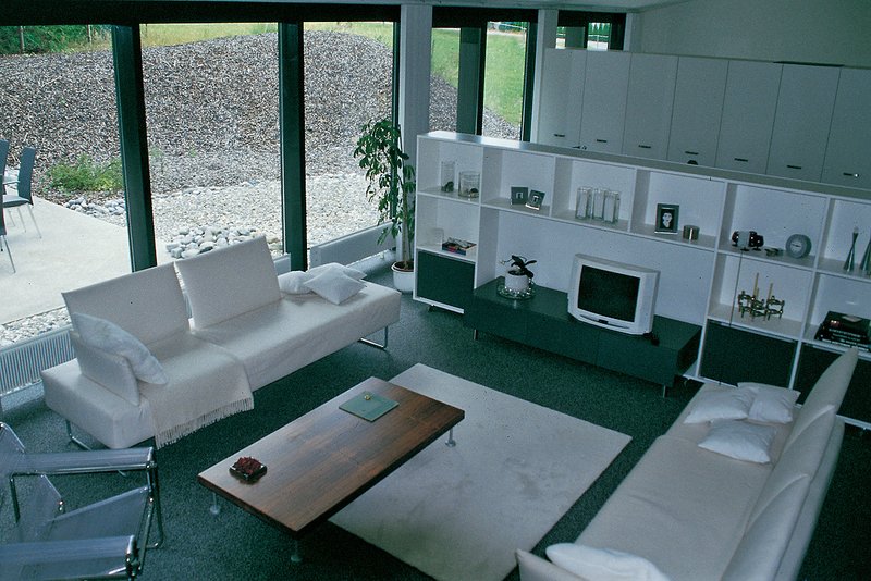 Das Energiekonzept Die gläserne Südfassade ist so ausgelegt, dass durch den speziell berechneten weiten Dachüberstand die Sonneneinstrahlung im Sommer gleich Null ist. Unterstützt wird dies durch den vorhandenen Laubbaumbestand, der die Südfassade in der Mittagszeit verschattet. Die Raumhöhe von bis zu 3,80 m hält genug Volumen vor, um etwaige Temperaturerhöhungen abzuführen. Im Winter der umgekehrte Fall. Die Laubbäume verlieren ihr Laub und lassen an Sonnentagen die Sonnenstrahlen ungehindert in die ganze Tiefe des Hauses eindringen. Der dunkelgraue Teppichboden erwärmt sich und der massive Bodenaufbau speichert die Wärme. Deckenventilatoren drücken aufsteigende Wärme wieder nach unten in den Wohnbereich.