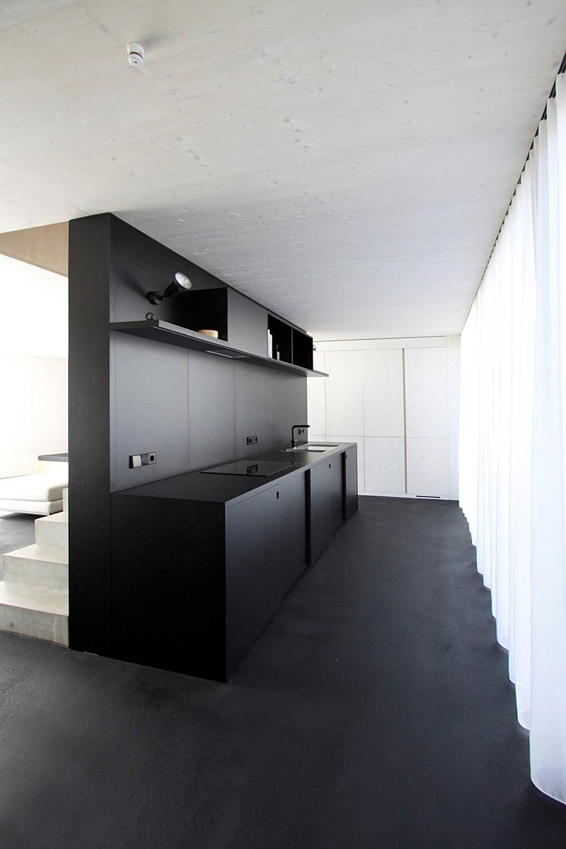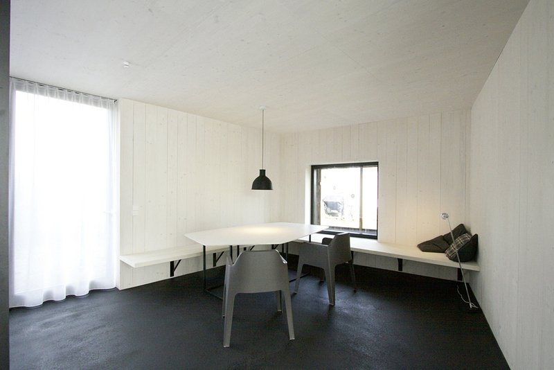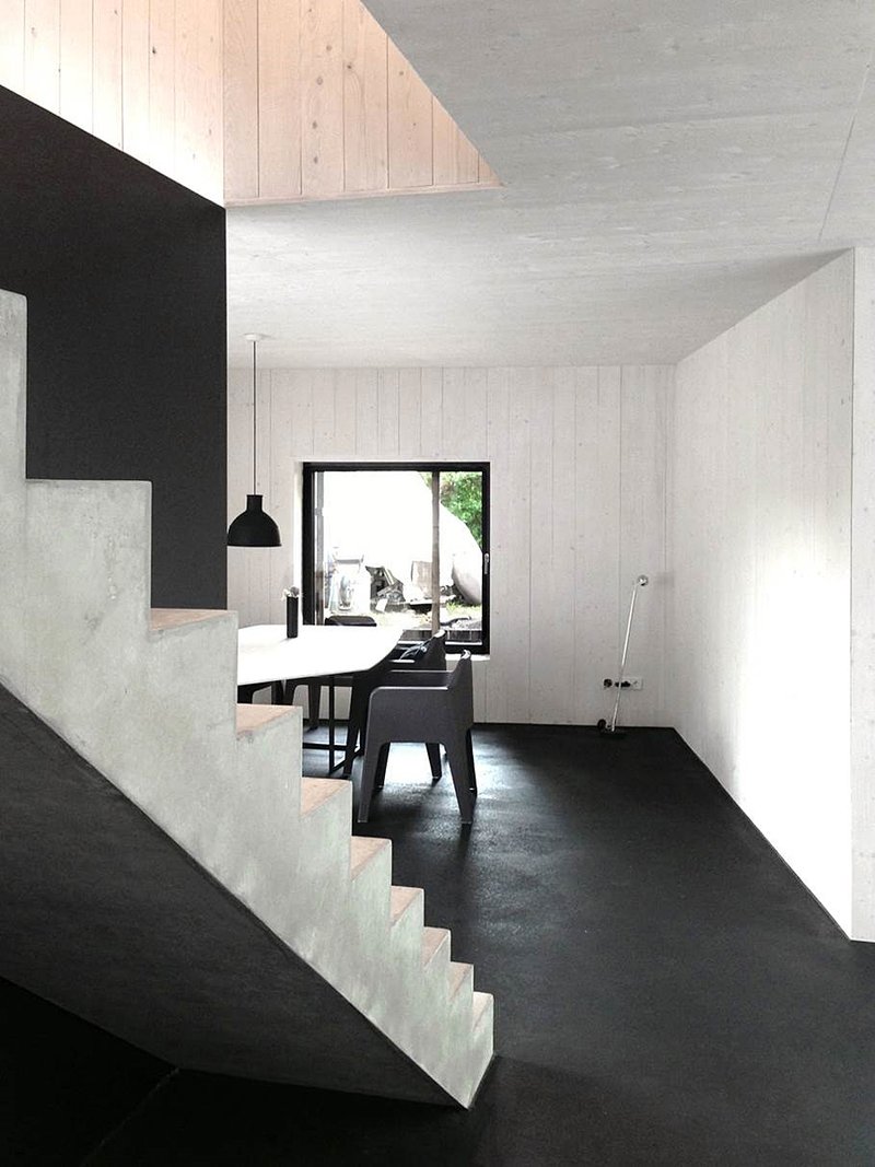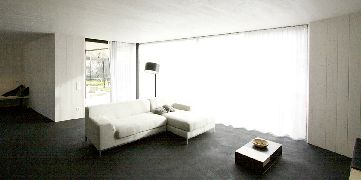 Das Innere des Hauses zeigt sich als veredelter Rohbau. Gussasphaltböden und naturbelassene Holzwände bestimmen das Bild im Innenraum. In den Nassbereichen werden einzelne Flächen mit einer farbigen PU-Abdichtung versiegelt und vor Feuchtigkeit geschützt.