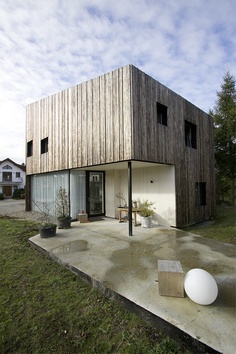 Der Gebäudekörper selbst macht sich hingegen frei von der Nachbarbebauung und bezieht sich auf die optimale Ausrichtung zum Garten und zur Sonne. Das in massiver Holzbauweise erstellte Haus ist umhüllt vojn einem "chiffonartigen Umhang" aus unregelmäßig angebrachten und angeflammten Holzlatten. Das Abrücken der Fassade im Süden lässt eine Zwischenschicht entstehen, die sowohl als Sonnenschutz als auch Austritt im oberen Geschoss fungiert; auch umhüllt die Fassade den Carport im vorderen Grundstücksbereich.