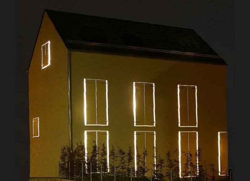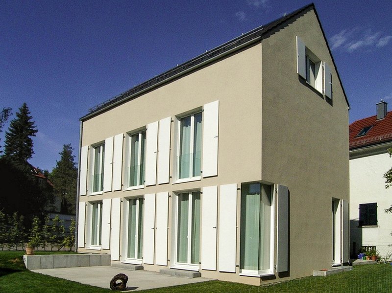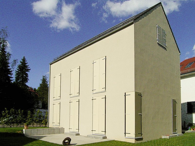 Architektonisch entlehnt der Neubau Stilelemente aus dem Kontext und interpretiert diese neu. Neben der Geschossigkeit und dem unbesetzten Satteldach sind der fein gezahnte Dachüberstand und die Fensterläden die prägenden Charakteristika. Die Klappläden dienen funktional als Sonnen und Blickschutz und ermöglichen mit ihrer farblich differenten Corean-Beschichtung wechselweise eine extrovertierte Eleganz oder einen monochromen Kubismus. Durch die Fuge zwischen Fensterladen und Fensterleibung dringt ausreichend Helligkeit für eine natürliche Belichtung der Räume trotz effektivem Sonnenschutz. Die hinterleuchteten Fugen zeichnen die Konturen der Gebäudeöffnungen nach und lassen den architektonischen Charakter auch bei Dunkelheit erahnen.