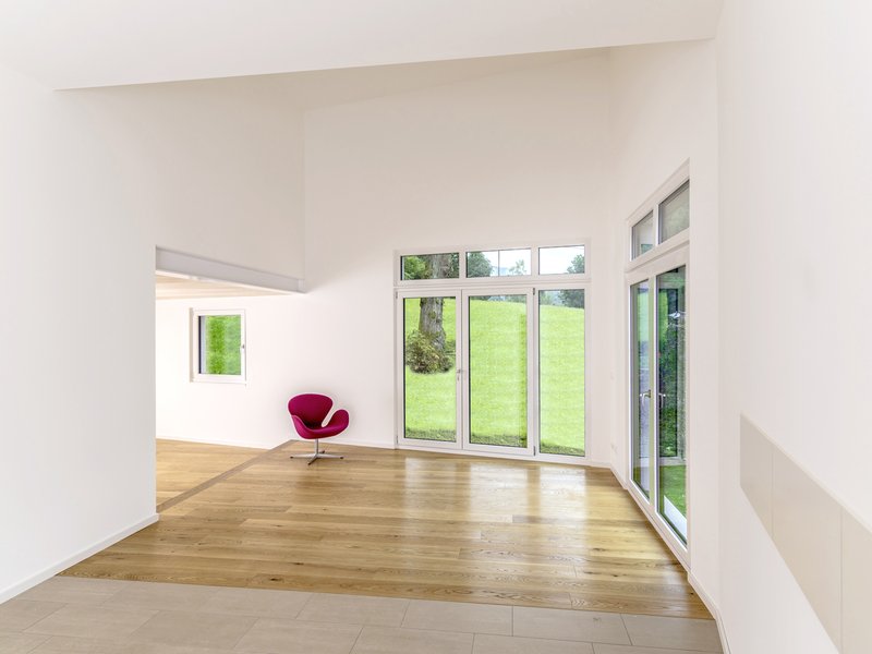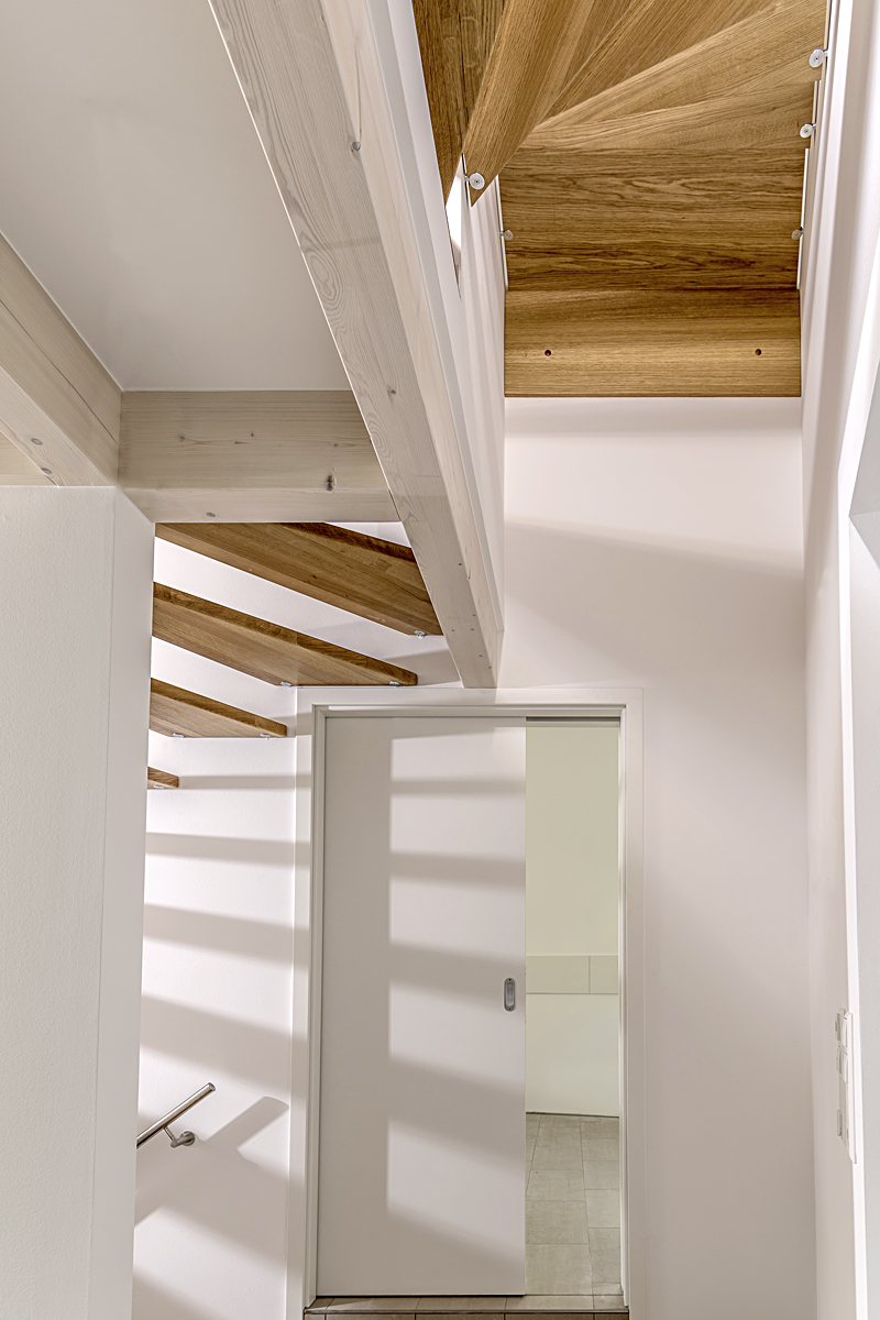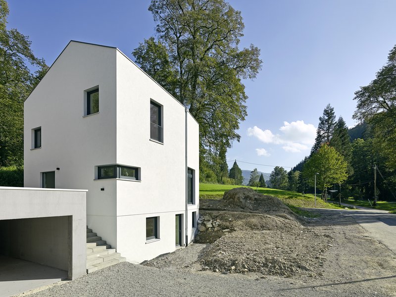Die angeschnittenen Gebäudeecken sind eine kleine Maßnahme - jedoch mit großer Wirkung: Äußerlich wird der Eindruck des kubischen, blockhaften eines Felsens oder geschliffenen Steines durch steigende und fallende Trauflinien unterstützt – und im Inneren entstehen spannungsvolle Räume. Aber die Bauherrschaft suchte immer weiter, wünschte sich noch mehr als "nur" Räume. Deren Anzahl war vorgegeben und in einem lange währenden Prozess wurde nach einem Raumplan, einem Raum-Erlebnis gesucht. Das wird gefunden durch eine gedankliche Spaltung des Gebäudes unterhalb des Firstes: Angelehnt an den schützenden und lichtschluckenden Waldrand entstand im Osten die niedrigst mögliche Stapelung der (notwendigen) Räume inklusive eines heimeligen Kaminzimmers. Hierbei wird die baurechtlich zulässige Gebäudehöhe und Geschossigkeit maximal ausgeschöpft, aber nicht überschritten. Demgegenüber öffnet sich im Südwesten der Essbereich mit großzügiger, fast verschwenderischer Raumhöhe bis zum Dachraum und führt den Blick hinauf zum Schauinsland, holt Licht und Landschaft tief ins Gebäude und führt seinerseits hinaus – über die Terrasse hinauf in den Schwarzwald. Innen zeigt sich das Gebäude großzügig, hell und abwechslungsreich. Begangen werden die Ebenen über einläufige Treppen. Doch in der Schlafebene führen plötzlich zwei Treppen weiter nach oben: Um der Wohnküche Raumhöhe zu schenken, wurde der darüber liegende Schlafraum höher als das behütende Kaminzimmer gehoben. Das nach außen kompakt und schlicht auftretende Gebäude entpuppt sich als ein Konstrukt von Räumen unterschiedlichster Geometrie, Dimension und Proportion und bietet so trotz seiner Bescheidenheit ein überraschendes Gebäude.