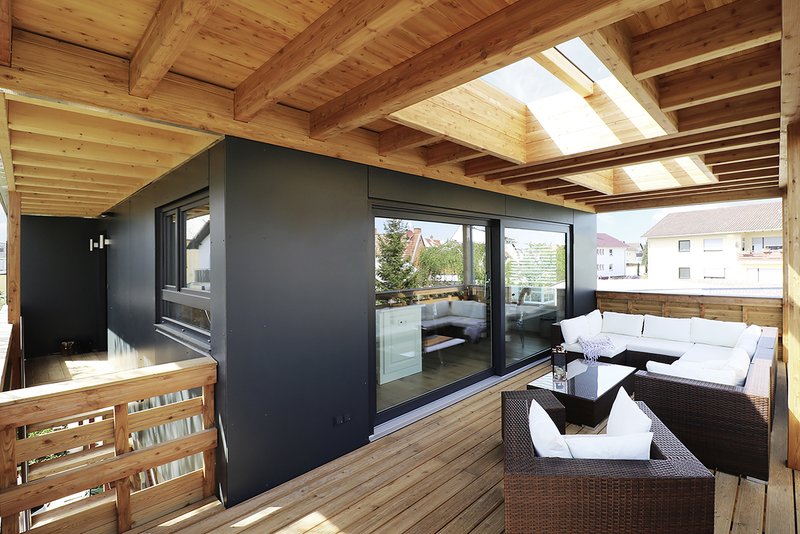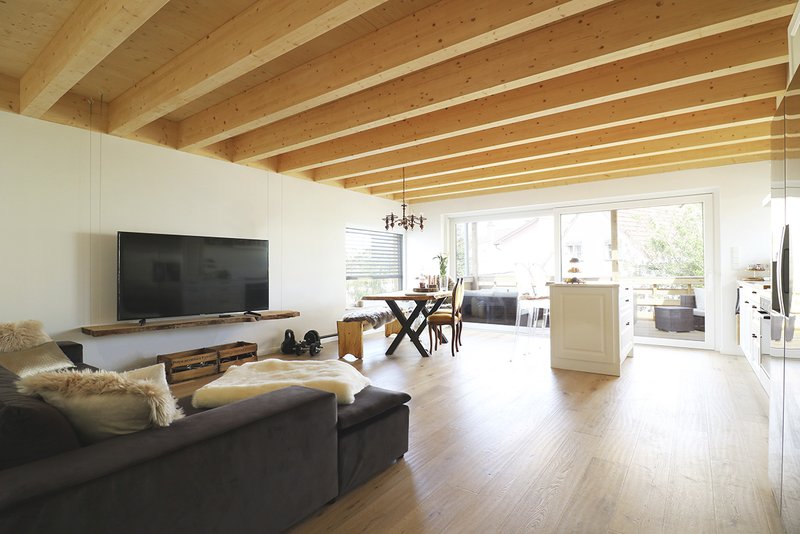 Um die kleine Fläche möglichst gut auszunutzen, wurde der Grundriss der knapp 100 m² großen Wohneinheit so offen wie möglich gehalten. Der offene Koch-Wohn-Essbereich wird dabei durch eine großzügige, überdachte Terrasse erweitert. Die sichtbare Holzdecke und der Blick in das erhaltene Grün des Gartens verflechten den Innen- und Außenraum gestalterisch miteinander. Durch das Zusammenspiel des geringen Gebäudevolumens, der Konstruktionsart in Holz und der Nutzung der bestehenden Heizanlage im Bestandsgebäude konnte ein zeitgemäßer Anspruch an die Nachhaltigkeit des Gebäudes erfüllt werden.
