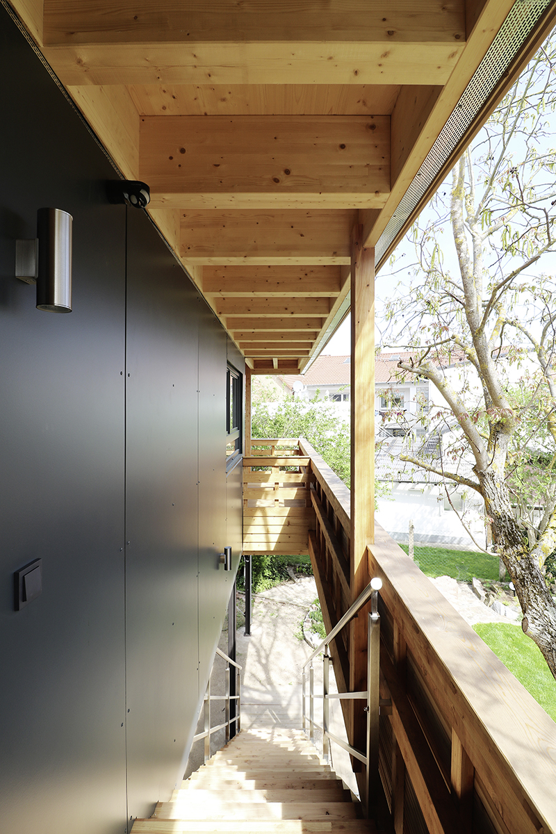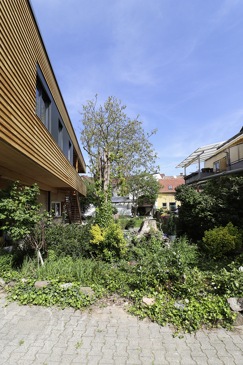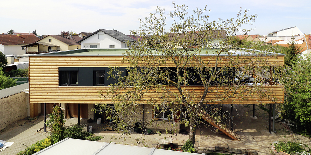 Auf dem für ländliche Verhältnisse bereits stark bebauten Grundstück in Waghäusel ist durch Nachverdichtung neuer Wohnraum entstanden. Der spielerisch auf die Bestandsgaragen aufgesetzte Baukörper vereint durch seine Positionierung und Leichtigkeit die limitierenden Faktoren des geltenden Baurechts und des erhaltenswerten Baumbestandes mit der Zielsetzung, die räumliche Situation vor Ort nicht zu beengen. Durch die Wahl einer Holzkonstruktion auf Stahlstützen konnte der Grundgedanke des Entwurfs konsequent umgesetzt werden. Die an ein Baumhaus erinnernde Leichtbaukonstruktion entspricht dabei statisch den Anforderungen der Bestandsgaragen.