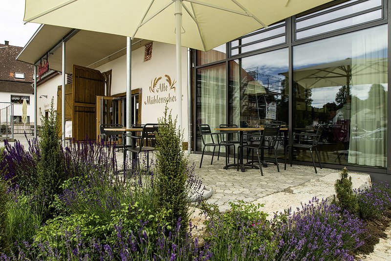 Ein ergänzender Neubau, bewusst abgesetzt, mit Flachdach, einer modernen Holzständerkonstruktion, Rombusverschalung und großflächigen Stahl-Glas-Pfostenriegelflächen erweitert die Fläche der historischen Mühlenscheuer und nimmt die Nebenräume wie Anlieferung, Personalbereich und WC-Anlage auf. Im Altbau ist der großzügige Verkauf, der Landmarkt und der Raum für die Backkurse angeordnet. Das Café orientiert sich durch die große Glasfassade nach außen gut sichtbar zur Durchgangsstraße. Die überdachte Außensitzfläche ist zum neu geschaffenen Dorfplatz, eine zweite Außenfläche mit großem Holzsteg zur Lauter hin orientiert.