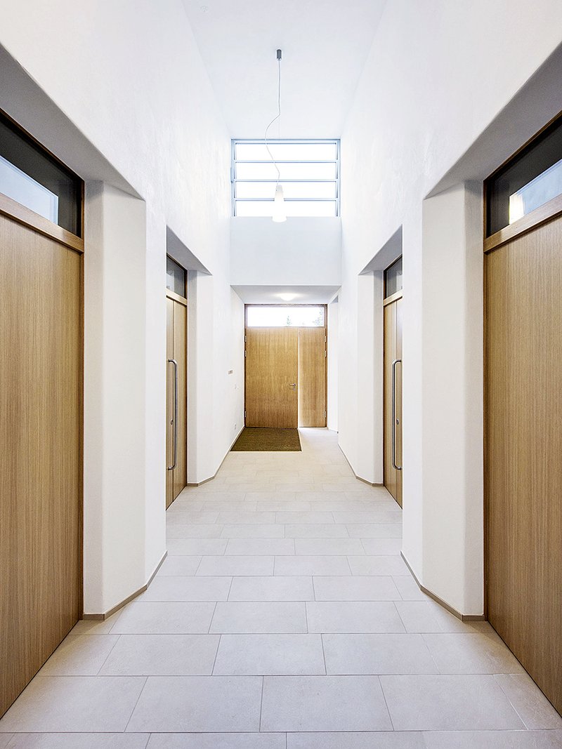 In der Baukonstruktion musste das System von vier unabhängigen Kühlräumen mit Mehrschichtigkeit in der Mauerwerkserstellung und mit einer Innendämmung gelöst werden. Eine durchgehende Deckenverglasung versucht mit LED-Beleuchtung eine tageslichtähnliche Beleuchtung über der Sargfläche - trotz Kühlraumsituation - zu erzeugen.
