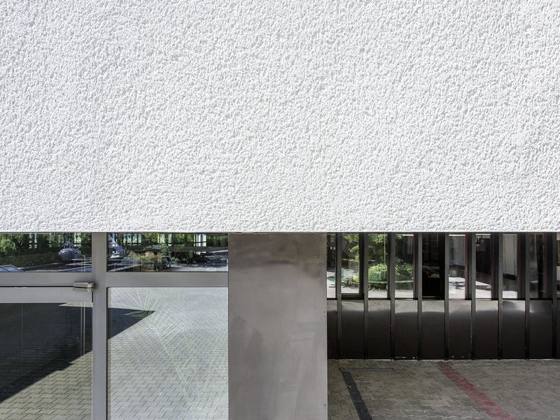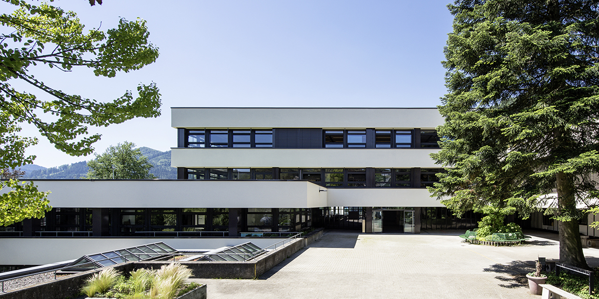 Der in den Hang modellierte kubische Baukörper wird durch eine strenge horizontale Anordnung von Betonbrüstungen und tiefliegenden Holz-Alu-Fensterbändern gegliedert. Um dem heutigen Stand einer energiesparenden Gebäudehülle gerecht zu werden, wurden die Betonfassaden mit ihren kennzeichnenden Brüstungen gedämmt und mit einem homogenen, strukturgebendem Kratzputz mit grober Körnung verputzt. Die zurückliegenden Glasfassaden in den beiden unteren Eingangsgeschossen bieten den Schülern überdeckte Eingangs- und Pausenbereiche. Die raumhohe Verglasung ermöglicht einen fließenden Übergang zwischen Innen und Außen. Die sich daraus ergebende Transparenz wird auch nach der Sanierung aufrechterhalten. So wird die Struktur der durchlaufenden Betonkassettendecken in den überdachten Außenbereichen beibehalten und verleiht dem Schulgebäude weiterhin seinen eigenen Charakter. Statt die auskragenden Decken flächig abzuhängen, werden die einzelnen Träger der Kassette gedämmt und verputzt. Die Deckenfelder werden ebenfalls gedämmt und mit einer Holzverkleidung aus Weißtanne versehen.