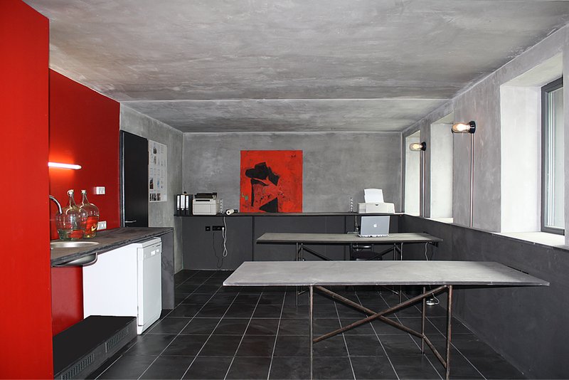 Die verputzten Betoninnenwände und Decken im Erdgeschoss erhielten wieder ihr natürliches Erscheinungsbild. Die Wände in den Obergeschossen wurden neu verputzt und mit Silikatfarbe gestrichen. Keine Tapete soll die Wärmespeicherung einschränken.