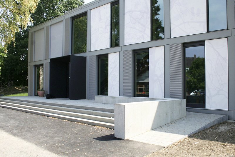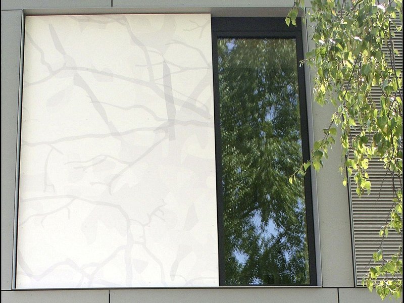 Der größte Unterschied zur Ursprungsfassade, neben den Lüftungslamellen und der bodentiefen Verglasung, sind die bedruckten Fassadenplatten anstelle des ursprünglichen Sichtmauerwerks auf der Eingangsseite. Mit der Bedruckung durch abstrakte Schattenbilder der Birkenbäume vor der Westfassade haben wir ein Gegengewicht zu der doch recht strengen Fassadenstruktur des Skelettbaus geschaffen. Hier findet je nach Wetter ein interessantes Wechselspiel zwischen dem bedruckten Schattenbild und dem realen Schatten bei Sonnenschein statt (Projektionsflächen).