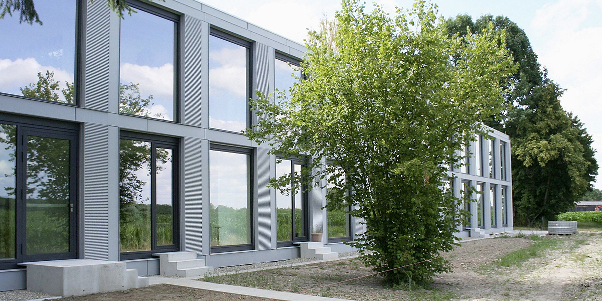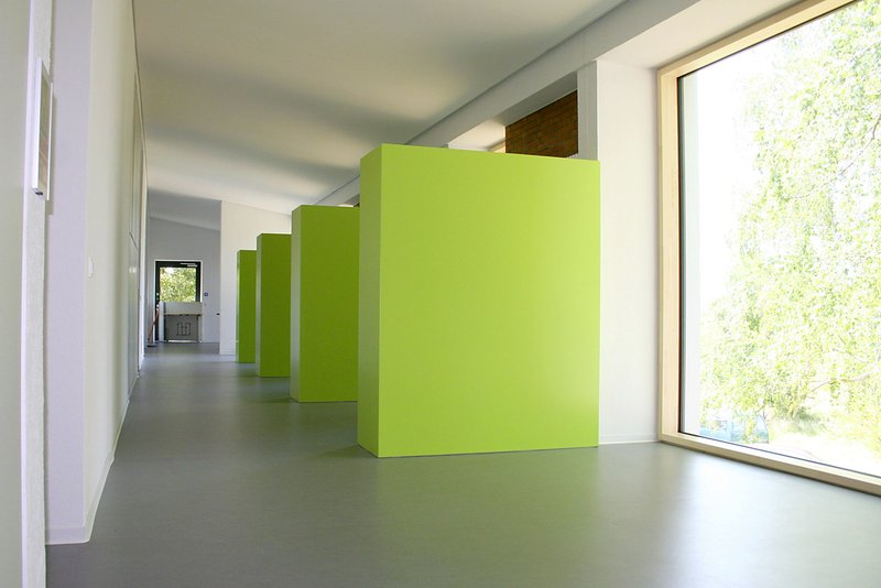 - Um den Außenbezug gerade zum östlichen Grünbereich zu verbessern, wurde die neue Holz-Aluminium-Pfostenriegel-Fassade, im Gegensatz zum Bestandsgebäude, bodentief ausgeführt und für jeden Aufenthaltsraum im Erdgeschoss ein Zugang zum angrenzenden Grünbereich geschaffen.
