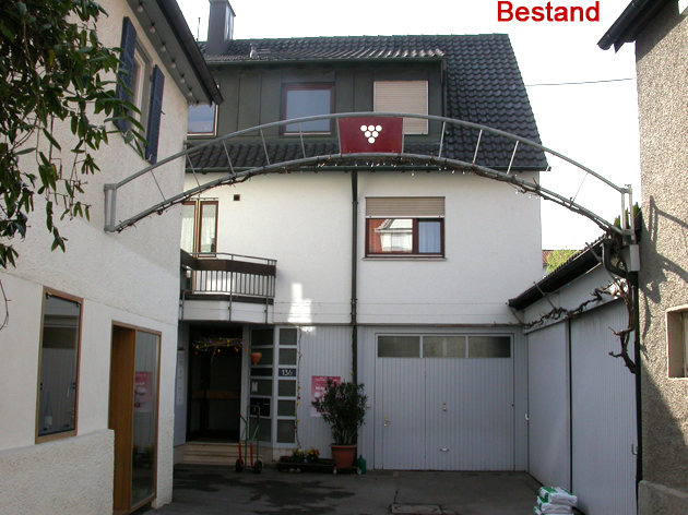 Der Hofbereich wird durch den Anbau eines großzügigen Vordaches aus Stahlbeton neu eingefasst; und bildet gleichzeitig den Rahmen für eine hölzerne, großzügige Pergola, die als lichtes, weinberanktes Lamellendach Raum bietet zum Keltern und für die traditionellen Weinfeste. Dabei nimmt das Vordach die Höhe und Attika vom Altbau (Garage) auf und führt diese in gleicher Höhe weiter.