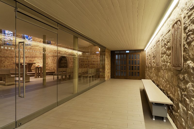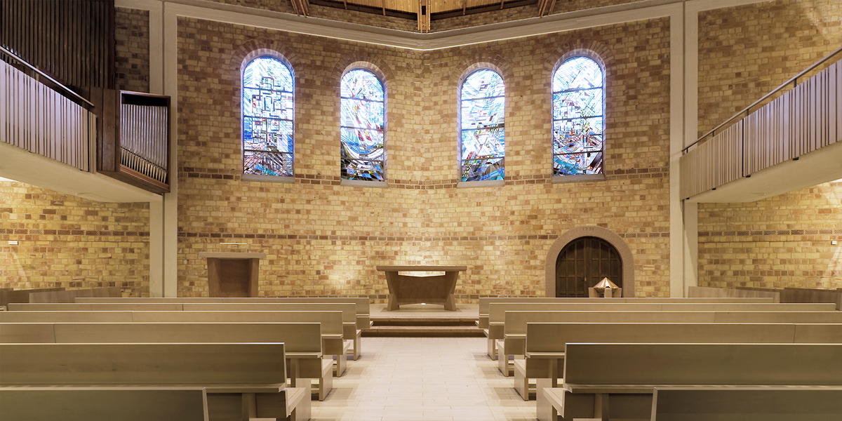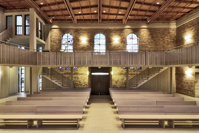 - Erneuerung der Beleuchtung: Neue blendfreie Decken- und Bodenstrahler ermöglichen durch unterschiedliche Ausrichtungen u.a. ein optimales Leselicht, eine punktuelle Ausleuchtung von Altar, Kanzel und Taufbecken sowie atmosphärische Licht. Zur Hervorhebung der vorhandenen Architektur wird das Ziegelmauerwerk indirekt beleuchtet.